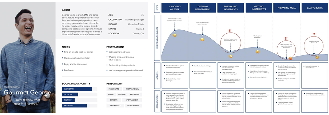 Using information from research, surveys and guerrilla interviews, we developed a persona to represent realistic personality profiles of prospective users. Gourmet George represents a tech-savvy male who would be the target audience for Perdue Farms. I used this persona constantly throughout the project to guide design decisions, priorities, and create empathy amongst the stakeholders and myself.