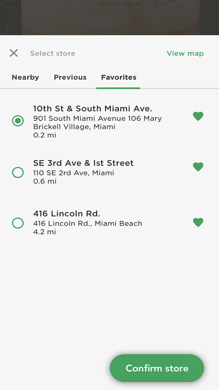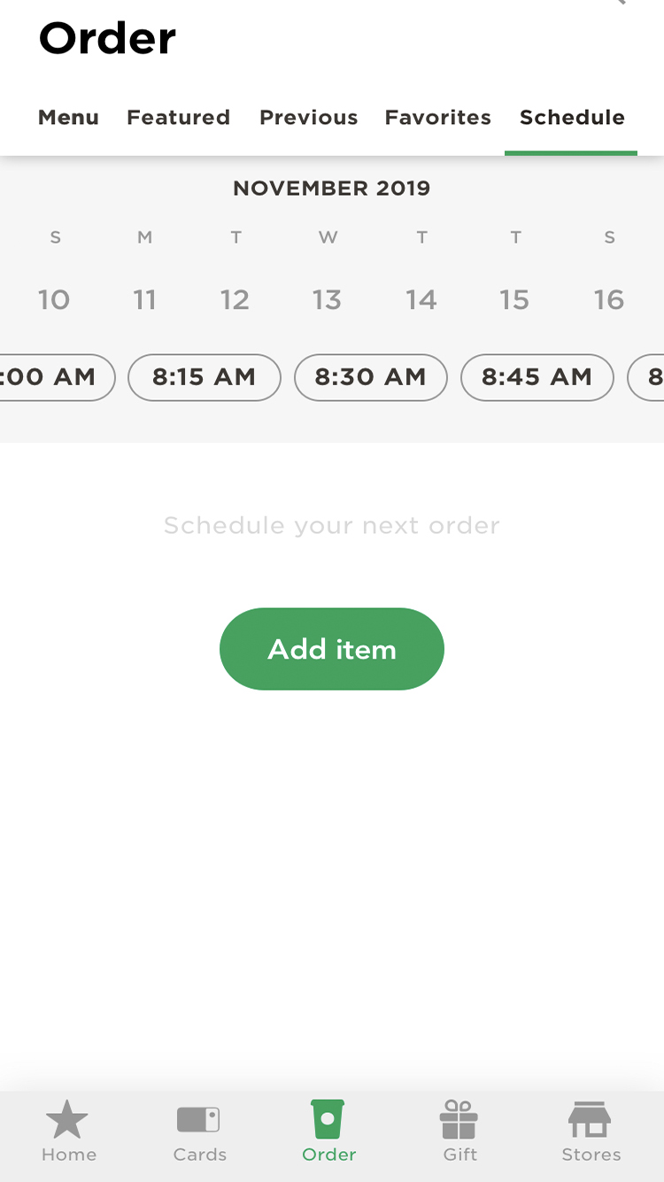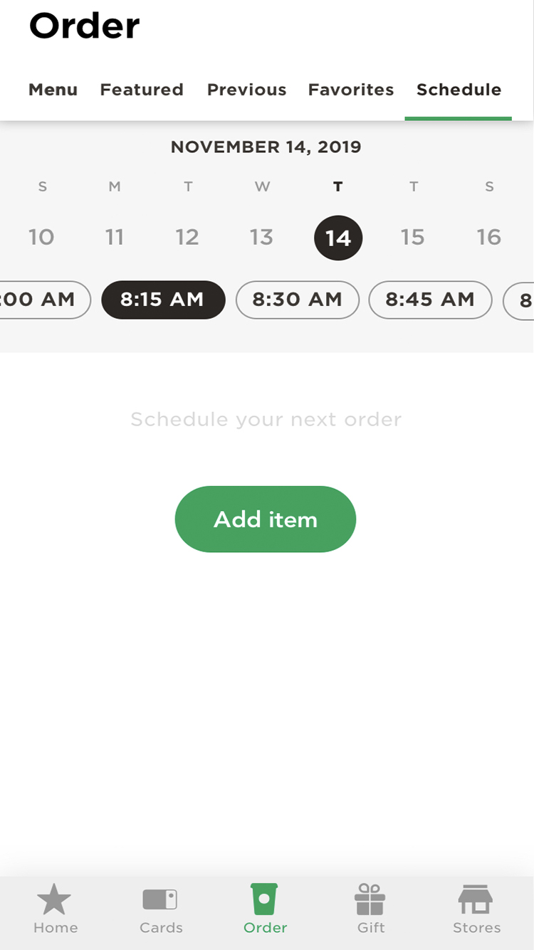 To integrate the look and feel of the Starbucks brand with the use of atomic design inventory a set of visual styles for the core components for the interface was developed. In addition to picking up the core styles of the existing app, several components and styles were created that were unique to the scheduling feature. The prototype demonstrates a user placing an order, a week ahead, to be picked up at their favorite location.